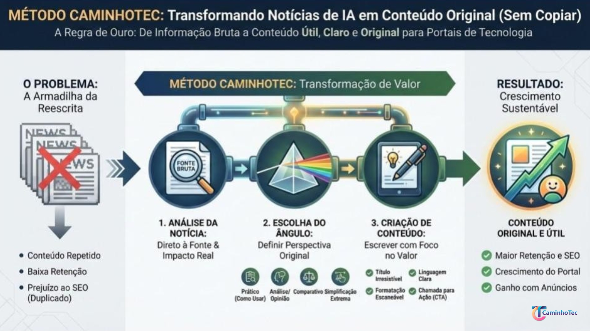 Esse método te permite publicar todos os dias com consistência, sem depender de “reescrita” e sem virar um site genérico. Aqui no CaminhoTec, a regra vai ser: sempre entregar utilidade + contexto + ação prática.